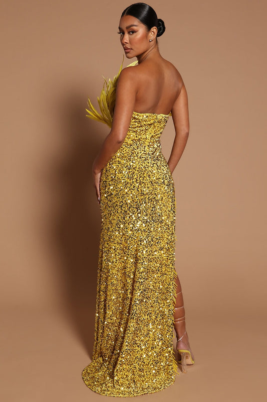 LLstyle Maxi Dress Velvet Sequin Metallic Gold Feathers