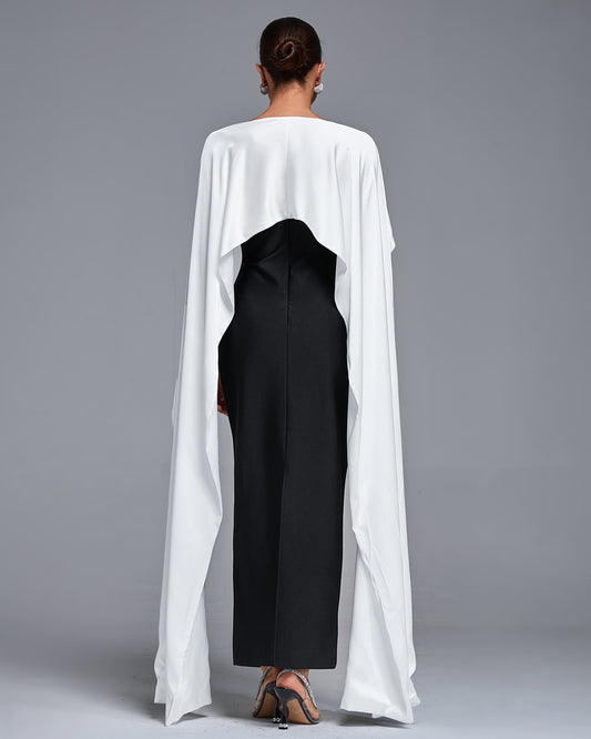 LLstyle Black Strapless Gown with White Draped Cape