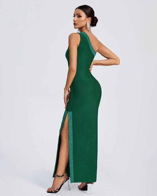 LLstyle Emerald One-Shoulder Sparkle Trim Gown