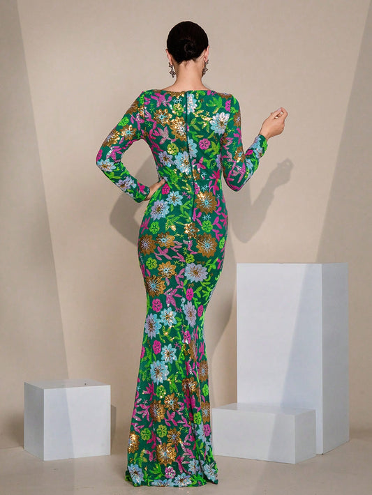 LLstyle Ladies' Random Printed Minimalist Long Sleeve Prom Dress