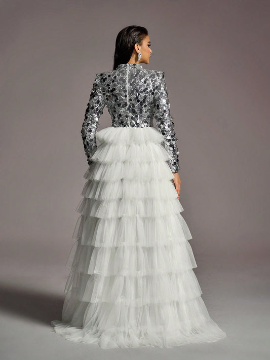 LLstyle Neck Sequin Bodice Contrast Layered Mesh Hem Wedding Dress