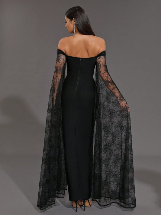LLstyle Elegant Black Off-Shoulder Lace Patchwork Flowy Bandage Dress