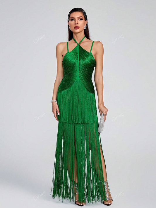 LLstyle Green Stylish Tassel Bandage Long Dress,