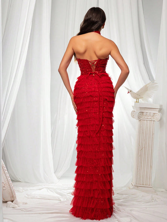 LLstyle Women's Sparkly Mesh Halter Neck Evening Dress