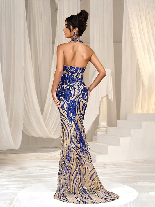 LLstyle Backless Halter Neck Mermaid Hem Floral Sequin Prom Dress