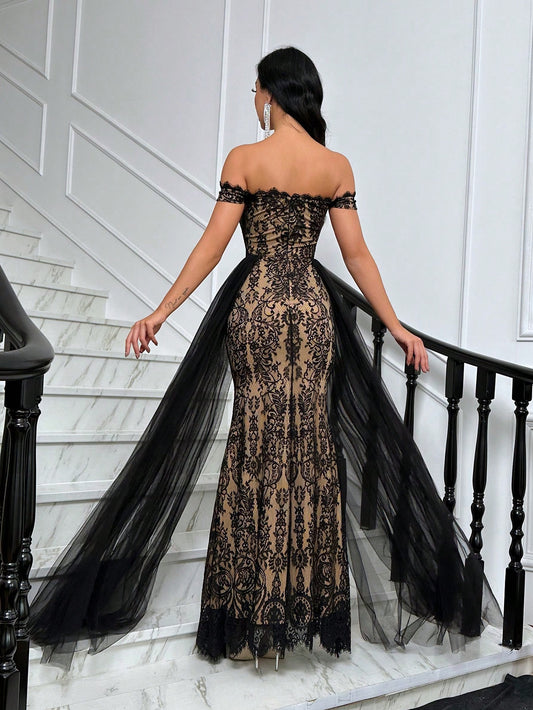 LLstyle Women Fashionable Black Lace Mesh Off Shoulder Party Dress
