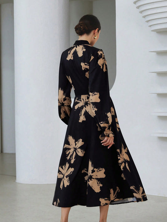 LLstyle Floral Print Stand Collar Cinched Waist Slim Fit Long Sleeve Dress