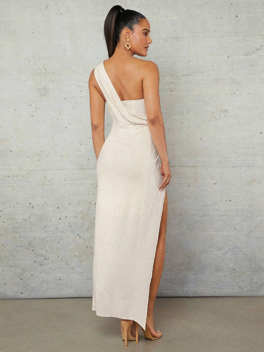 LLstyle Asymmetrical Draped Collar Elastic Long Dress