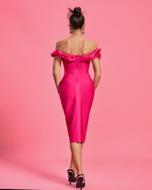 Title: LLstyle Hot Pink Off-Shoulder Ruffle Bodycon Midi Dress