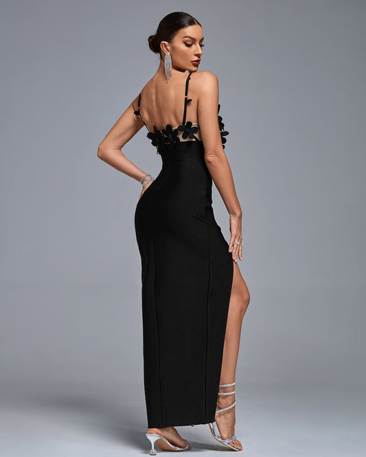 LLstyle Black 3D Floral Appliqué Slit Dress