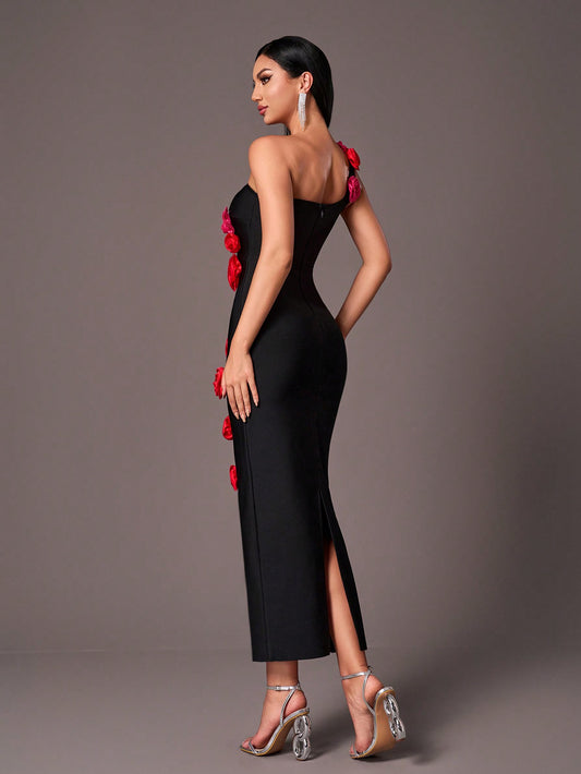 LLstyle Shoulder-Baring Solid Color Slim-Fit 3D Flower Cocktail Dress