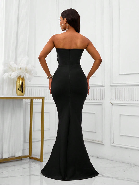 LLstyle Black Strapless High Waist Handmade Pearl Dress
