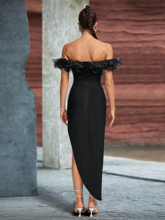 LLstyle Off Shoulder Mesh Dress With 3D Floral Lace Dress