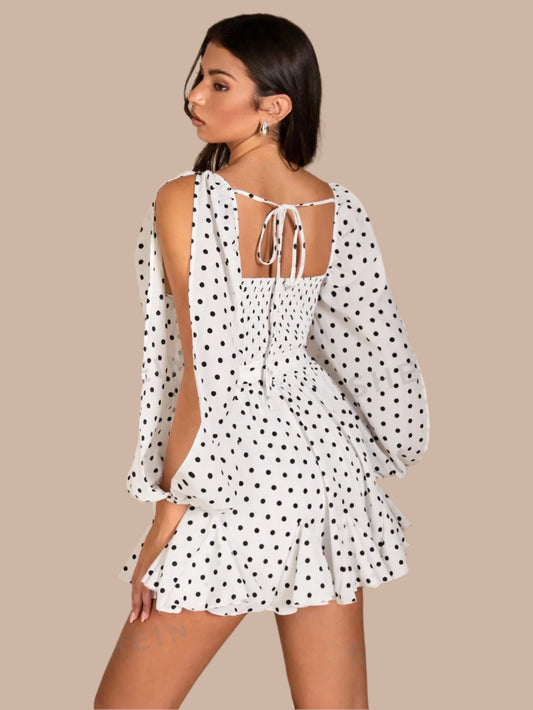 LLstyle Women's Black And White Polka Dot Romantic Long Sleeve Ruffle Dress