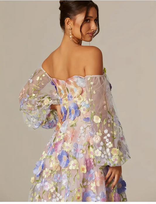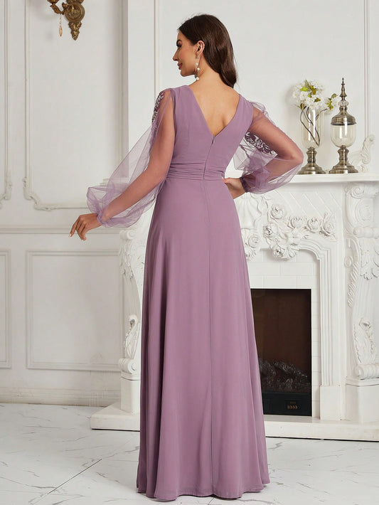 LLstyle Elegant Plain Color Contrast Mesh Embroidered Wrap Evening Dress