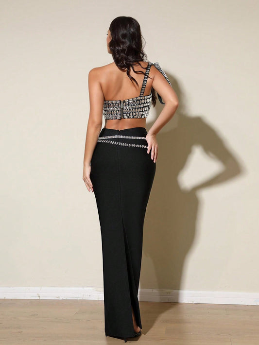 LLstyle One Shoulder Rhinestone Crop Top & Split Back Skirt