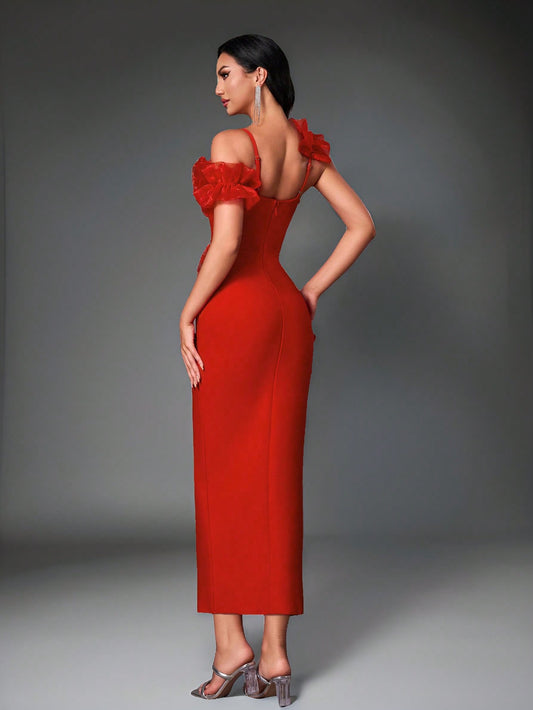 LLstyle Ruffle Patchwork Side Slit Bodycon Maxi Dress