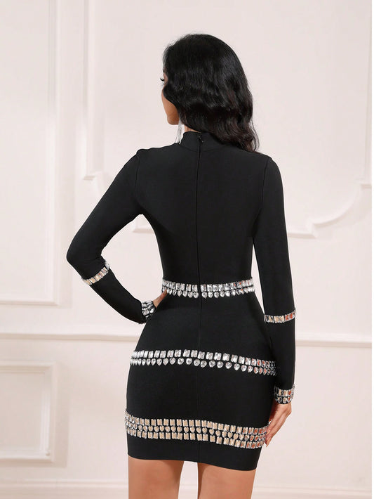 LLstyle Women Sexy Rhinestone Chains Cutout Long Sleeve Dress