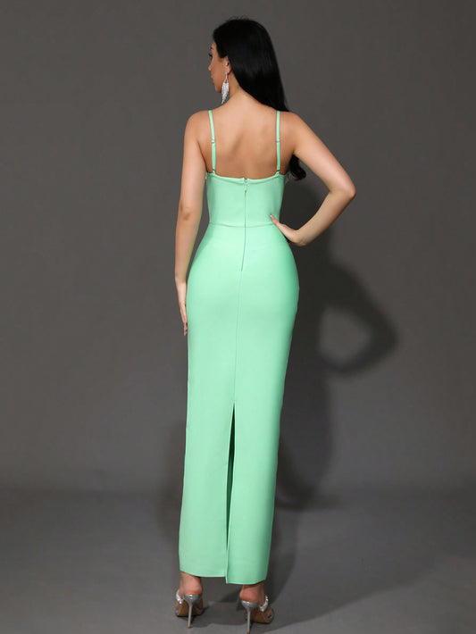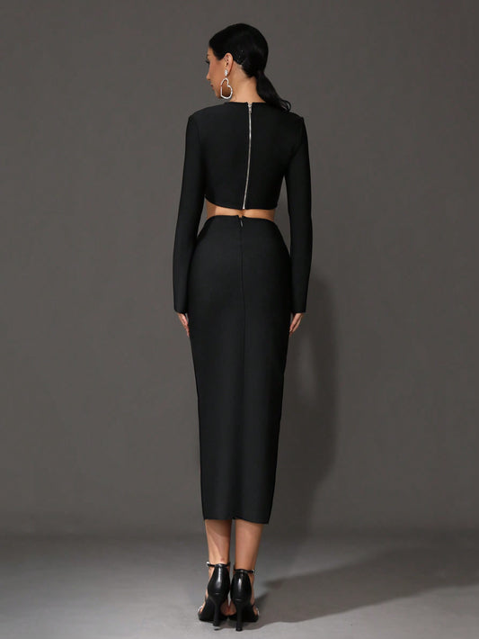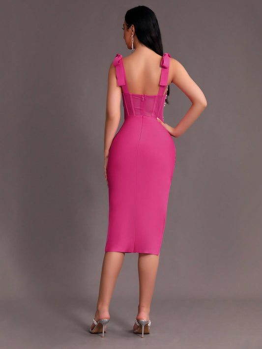 LLstyle New Bow Knot Rhinestone Mesh High Slit Bandage Dress