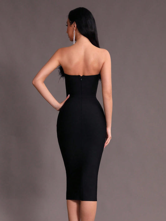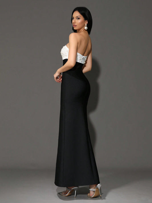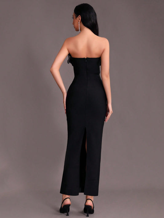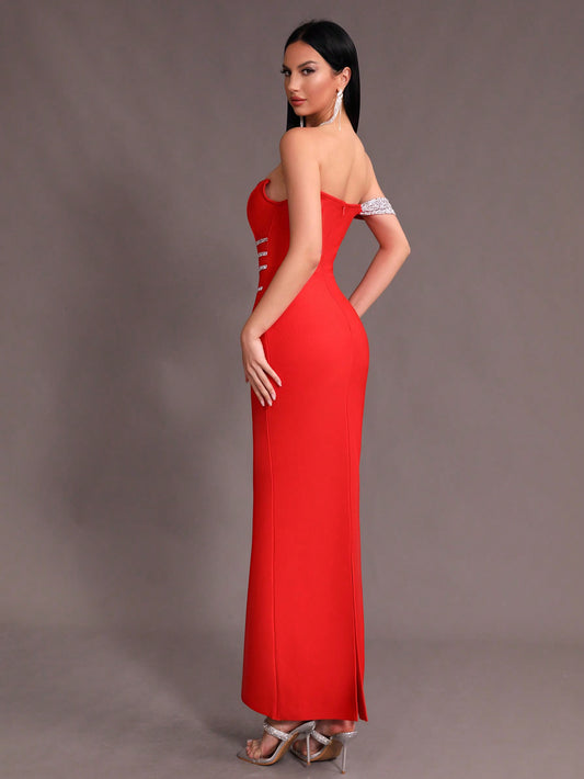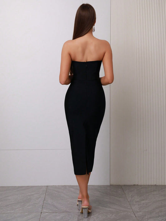 LLstyle Women Strapless Diamond-Embellished Side-Slit Bandage Dress