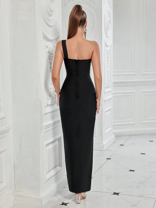 LLstyle One Shoulder Front Slit Party Dress With Nail Flower Decor