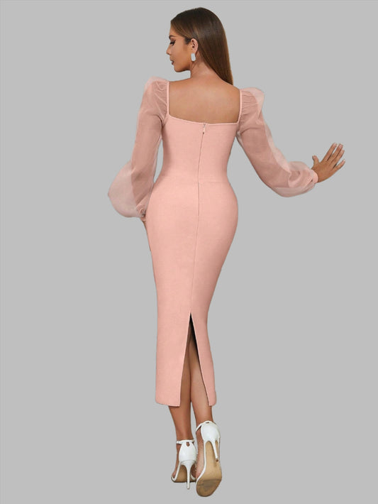 LLstyle Sweetheart Neck Contrast Mesh Lantern Sleeve Split Back Dress