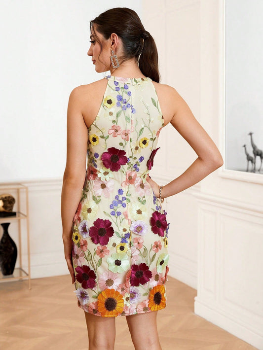 LLstyle Floral Embroidery Appliques Detail Satin Dress