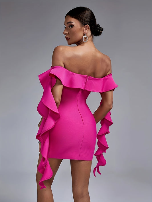 LLstyle Solid Off Shoulder Ruffle Trim Dress