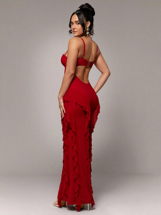 LLstyle Women's Elegant Romantic Date Camisole Red Floral Ruffle Backless Dress