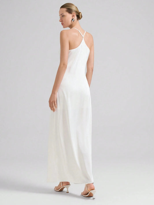 LLstyle New Elegant Metal Decor Front Split White Sleeveless Spaghetti Strap Dress