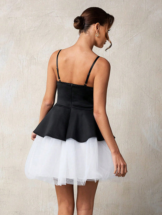 LLstyle Women's Contrast Color Mesh Ruffle Hem Slip Dress