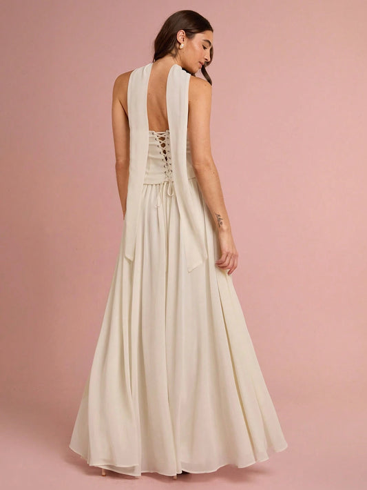 LLstyle Women's Cream White Pleated Hem Criss-Cross Dress