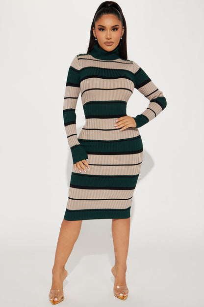Ribbed Midi Dress Turtle Neck Long Sleeve Gold Snapped Shoulder Detail Stretch Dress Length = 42" Disclaimer: Stripe Pattern May Vary. 68% Rayon 32% Polyester Imported