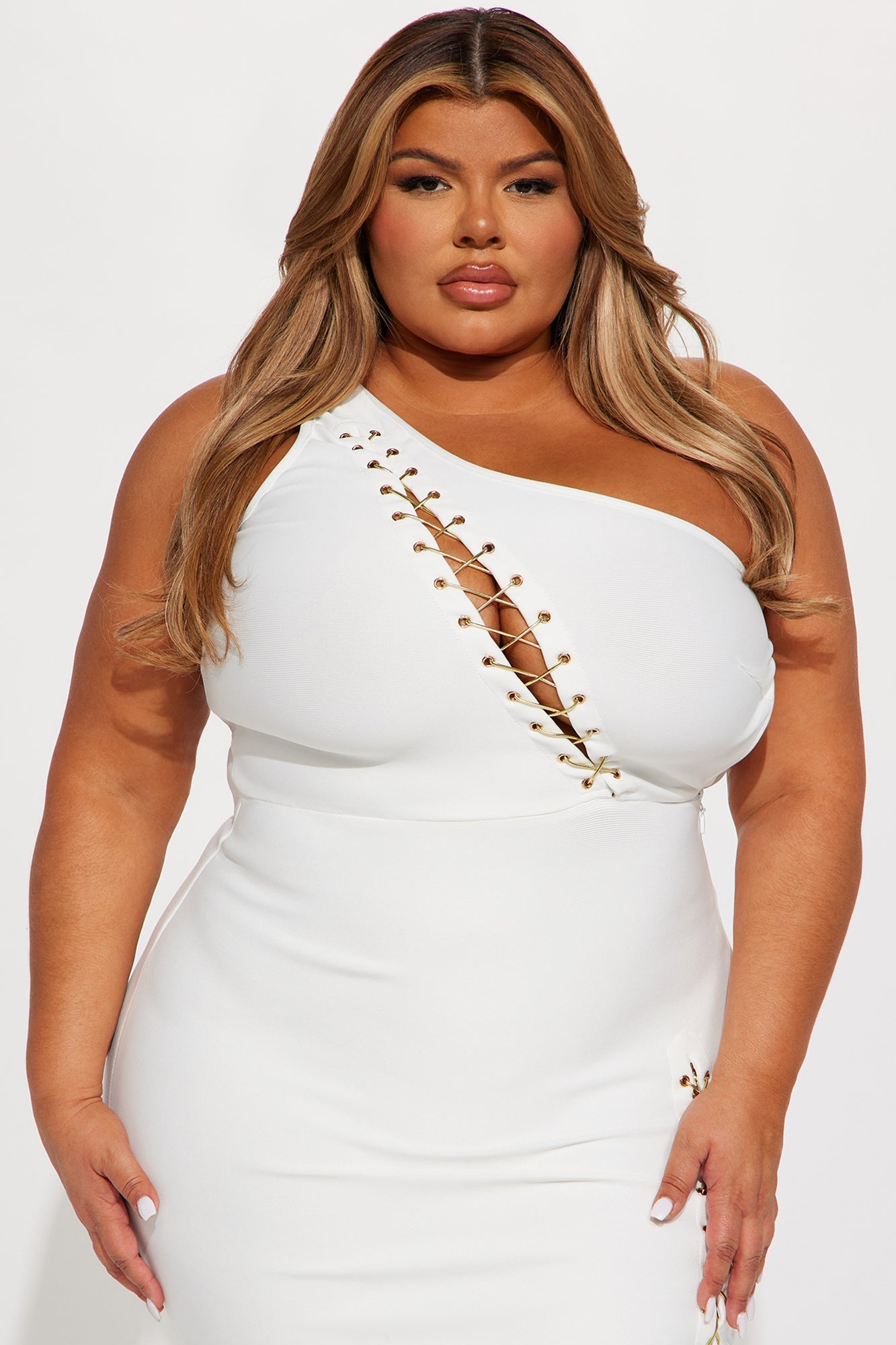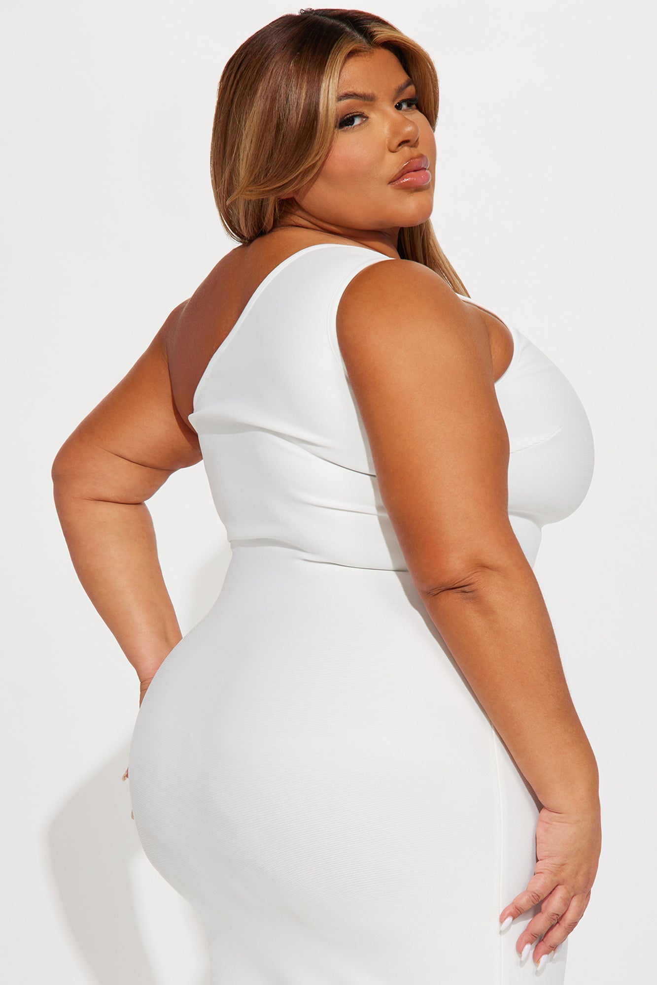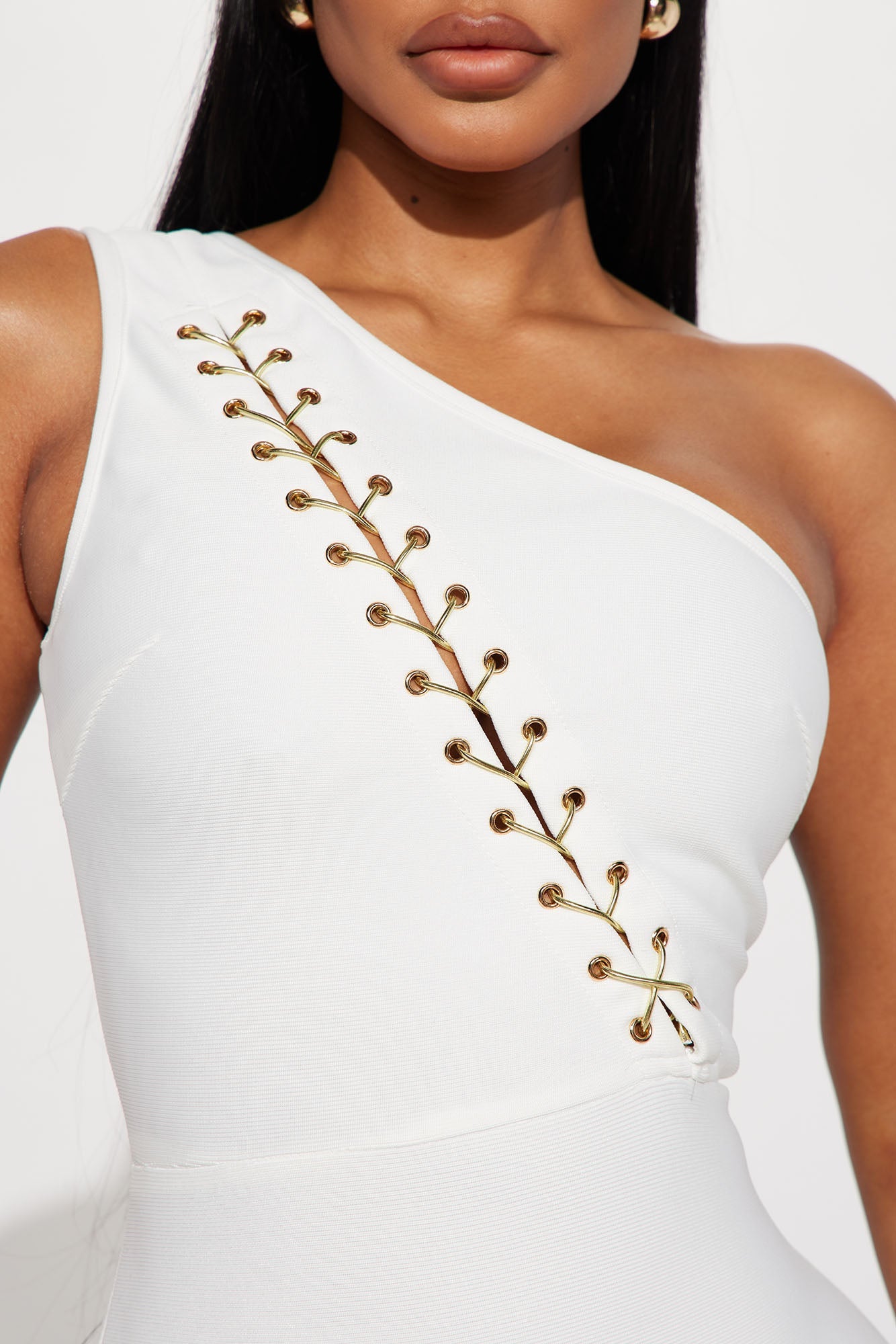 Bandage Midi Dress One Shoulder Cut Out Side Zipper Closure Gold Hardware Self: 95% Polyester 5% Spandex Imported