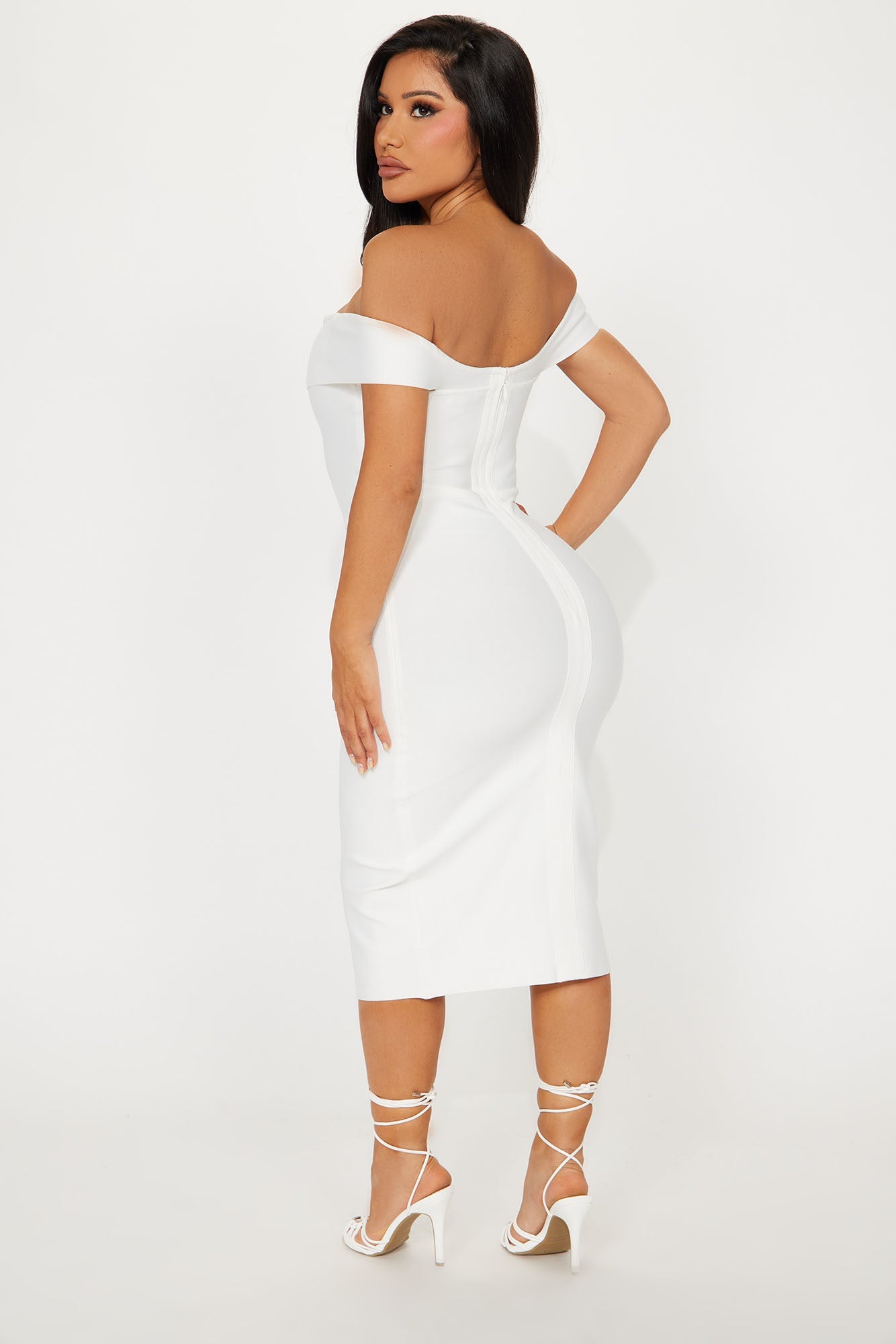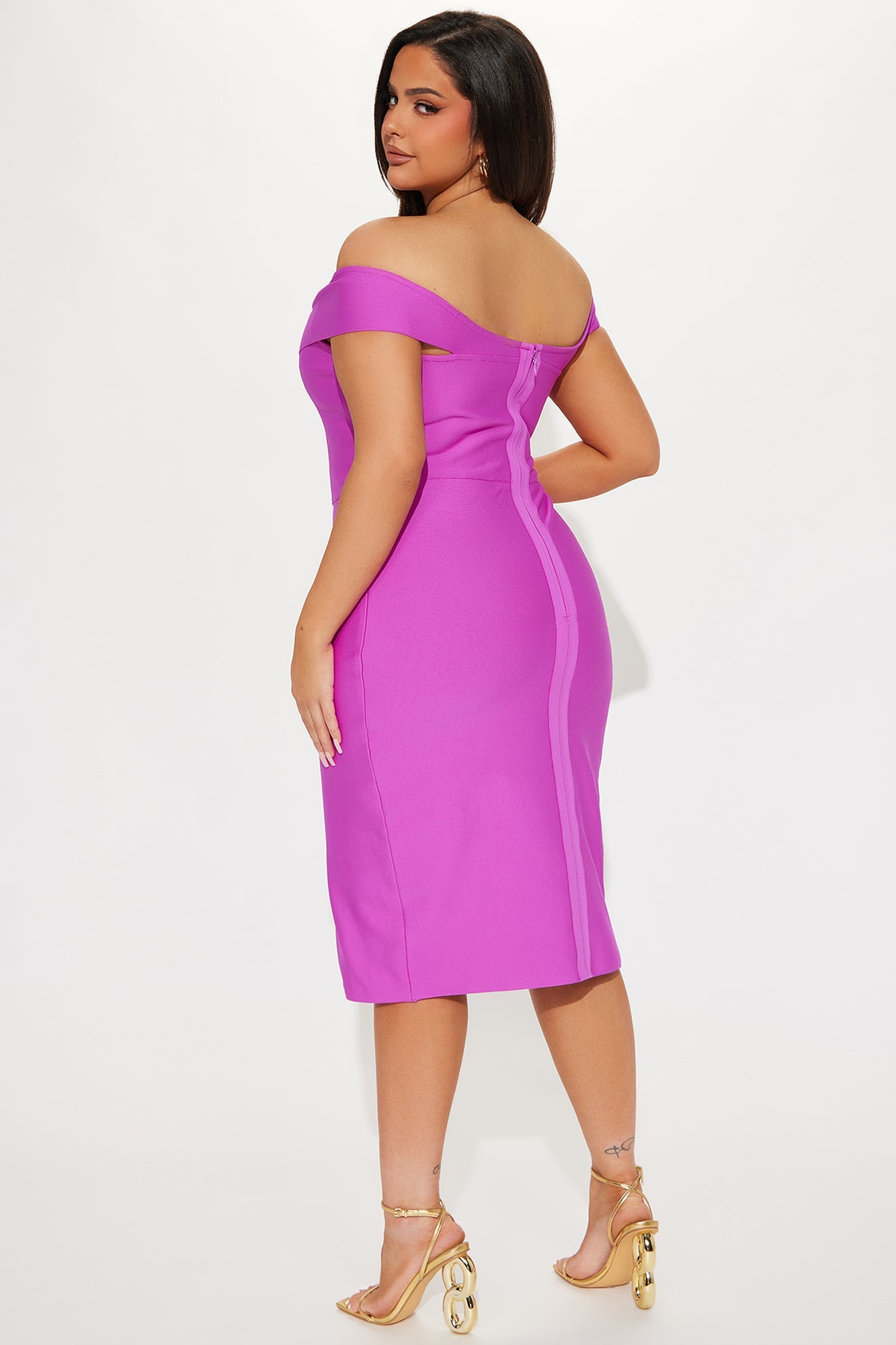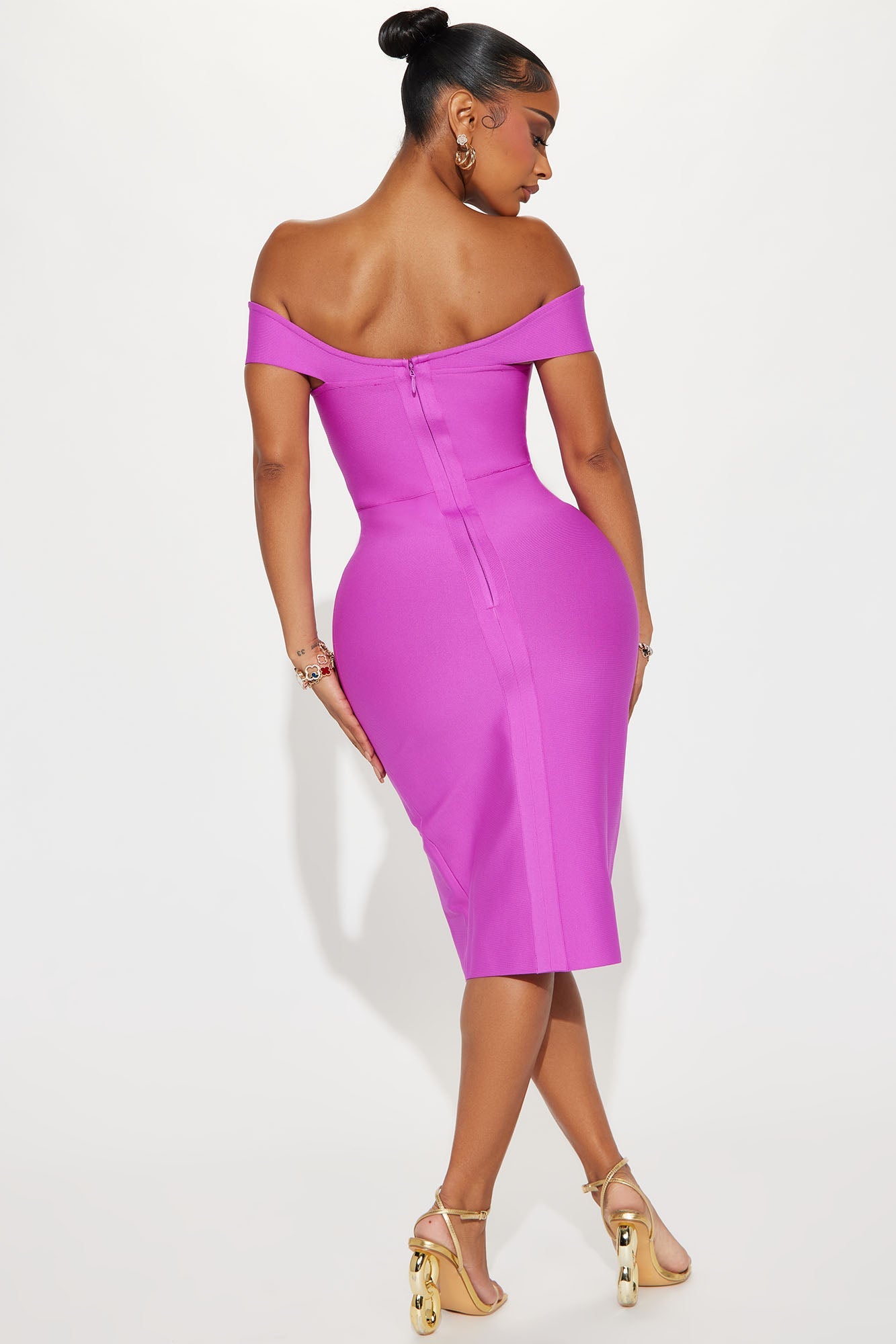 Available In Magenta And White. Bandage Midi Dress Off Shoulder Short Sleeves Hidden Back Zipper Stretch Dress Length = 44'' Self: 95% Polyester 5% Spandex Imported