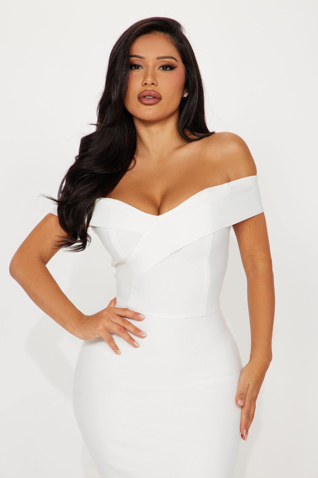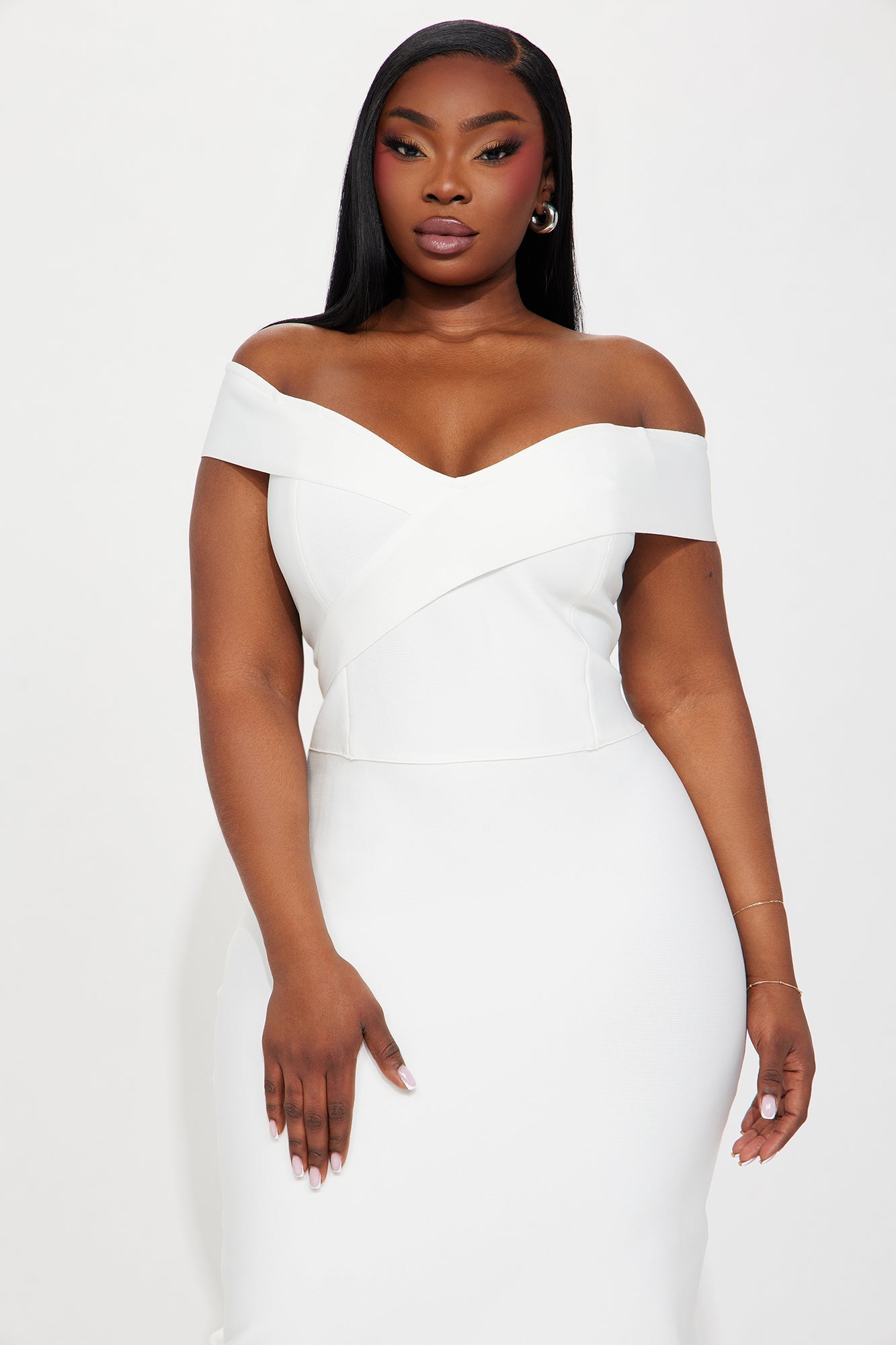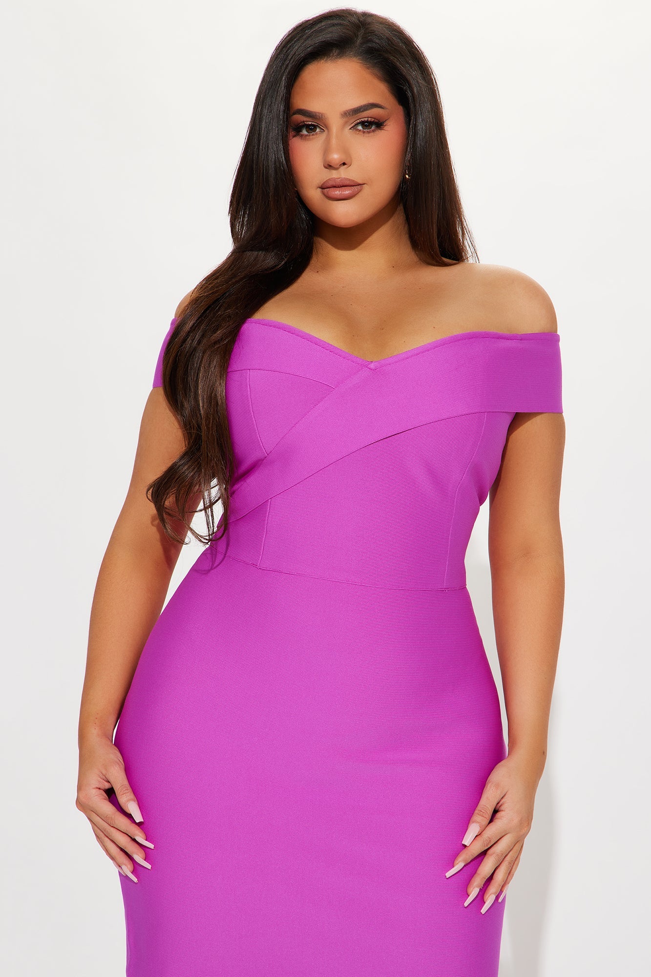 Available In Magenta And White. Bandage Midi Dress Off Shoulder Short Sleeves Hidden Back Zipper Stretch Dress Length = 44'' Self: 95% Polyester 5% Spandex Imported