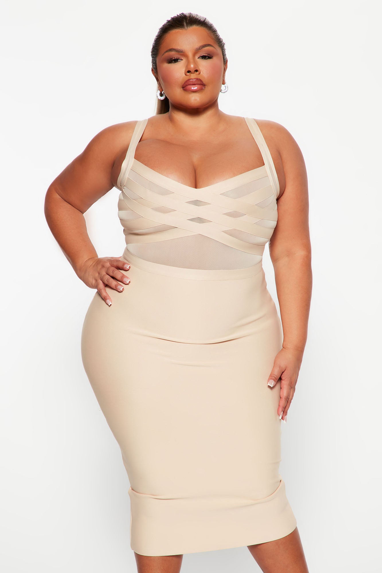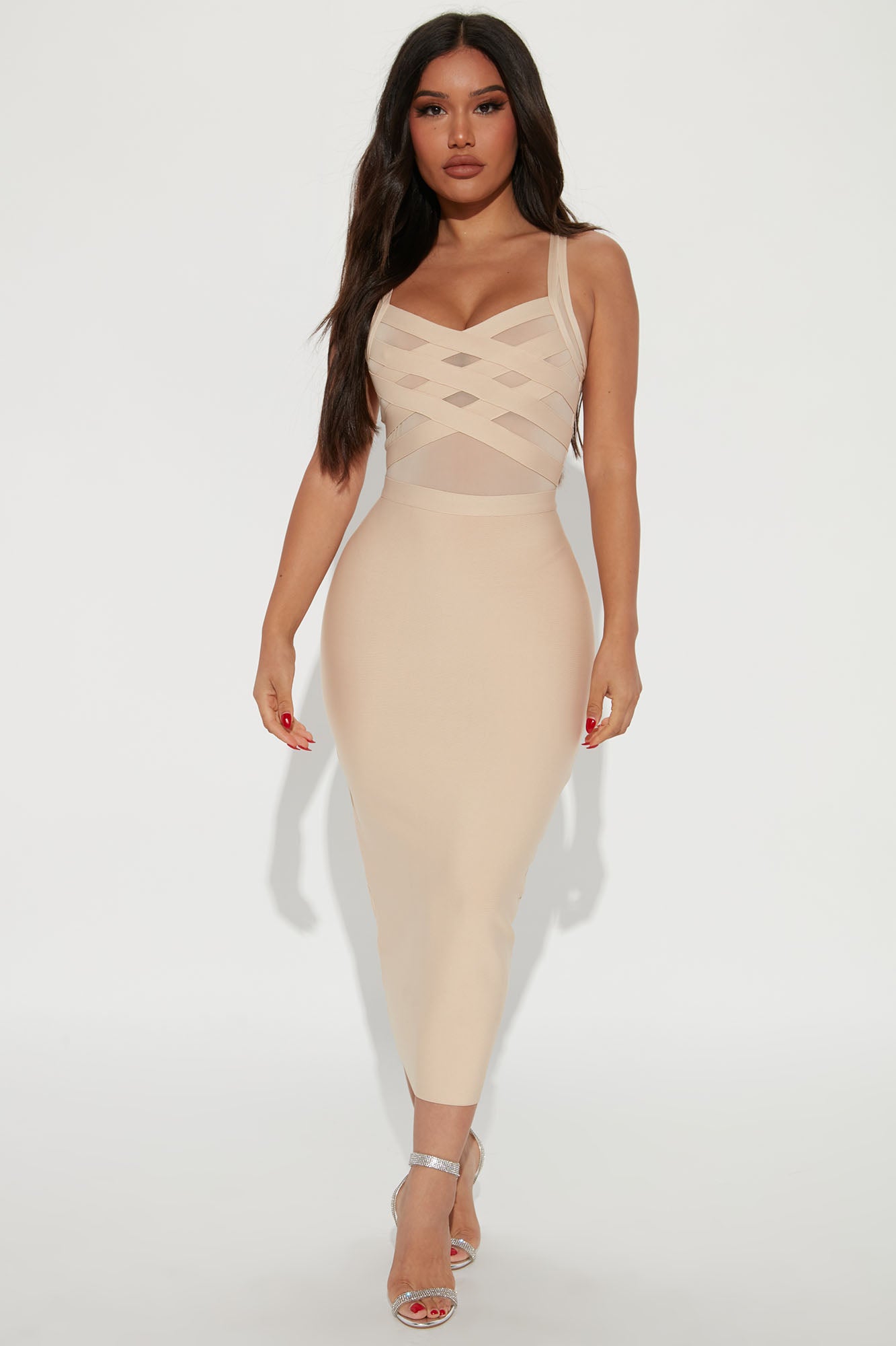 The Burgundy Bandage Midi Dress is a sleek and sophisticated choice for any special occasion. Designed with a sleeveless cut and a flattering V-neckline, it features mesh inserts that add a modern, sultry touch. Crafted from a stretch bandage fabric blend of 90% polyester and 10% spandex, it sculpts the figure while allowing comfortable movement. A hidden back zipper ensures a seamless finish. Elegant and versatile, this dress is perfect for evening events, parties, or formal gatherings.
