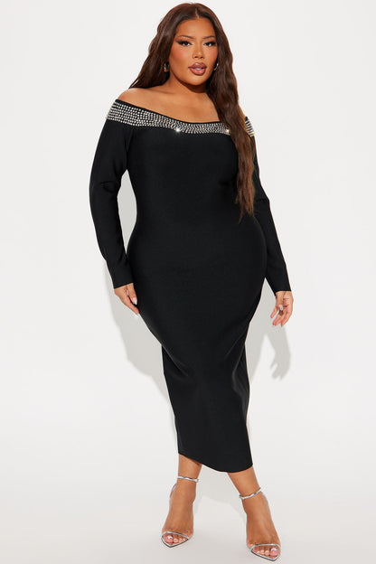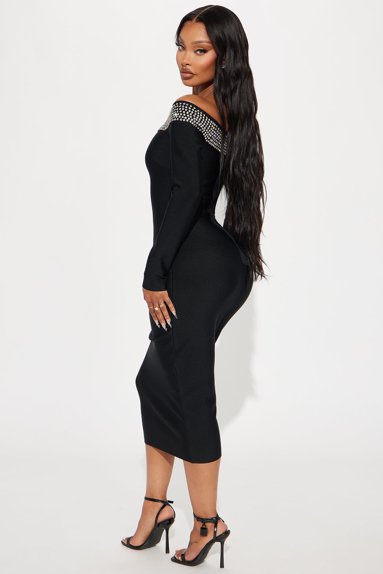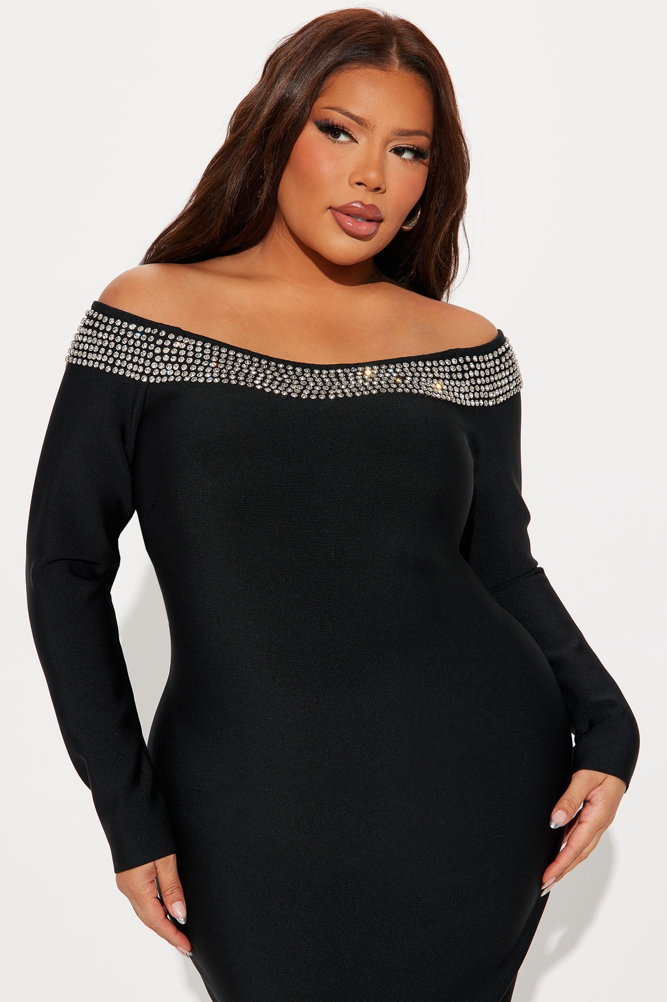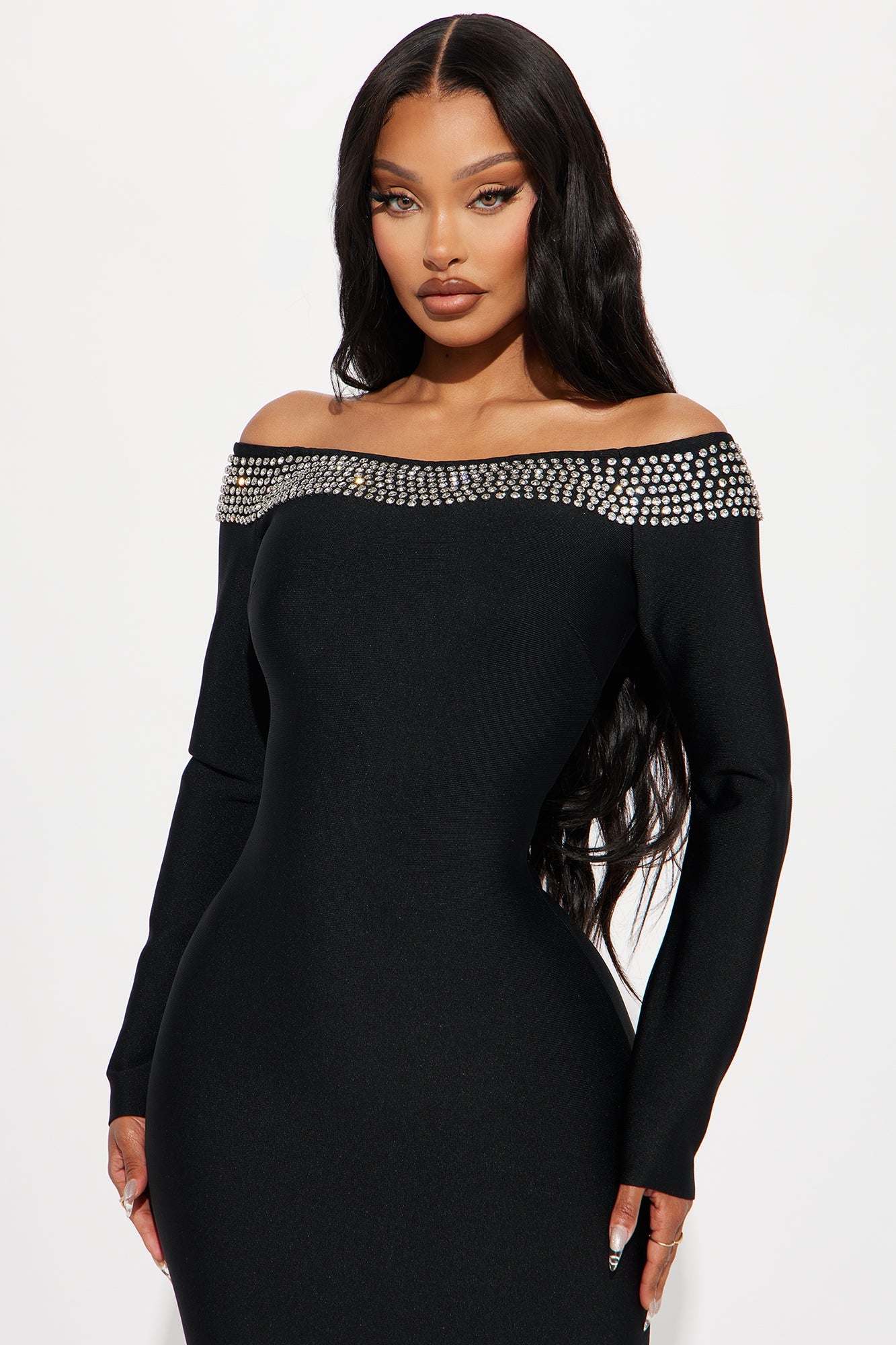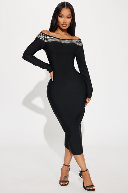 - Bandage Midi Dress Off shoulder Long sleeves Rhinestone embelleshed Back zipper Stretch Length = 46" Shell: 95% Polyester 5% Spandex Imported