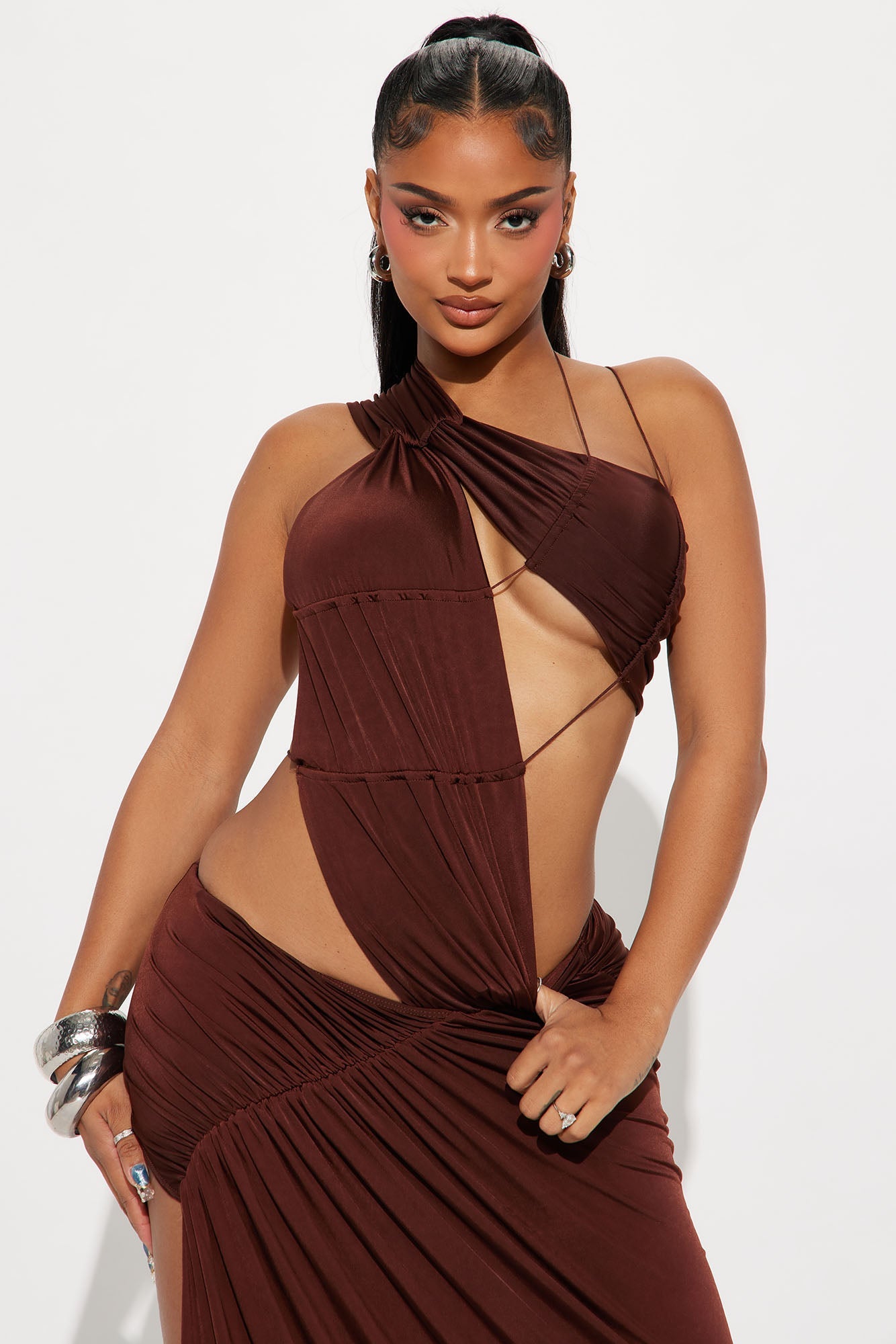 Maxi Dress Asymmetrical Sleeveless Cut Outs Backless Ruched High Side Slit Stretch 94% Polyester 6% Spandex Imported California