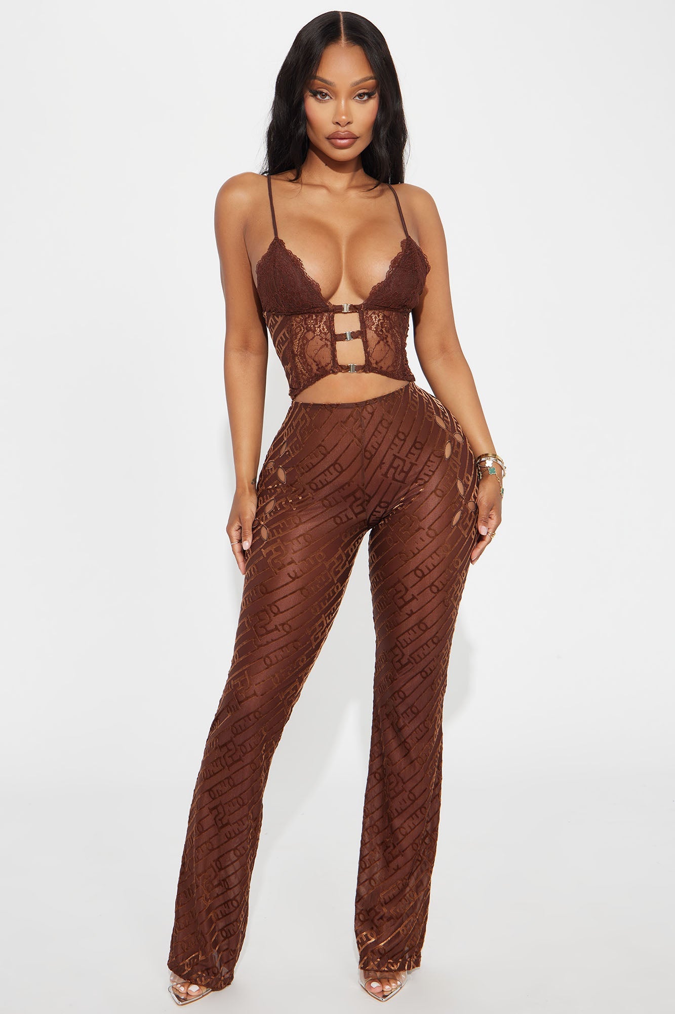 Velvet Burnout Pant Set Cami Top Adjustable Spaghetti Straps Front Cut Out Clasp Closure Partial Lining Straight Leg Pant Cut Outs Stretch 33.5" Inseam Self: 59% Polyester 30% Polyamide 11% Spandex Lining: 94% Polyester 6% Elastane Contrast: 90% Nylon 10% Spandex Imported