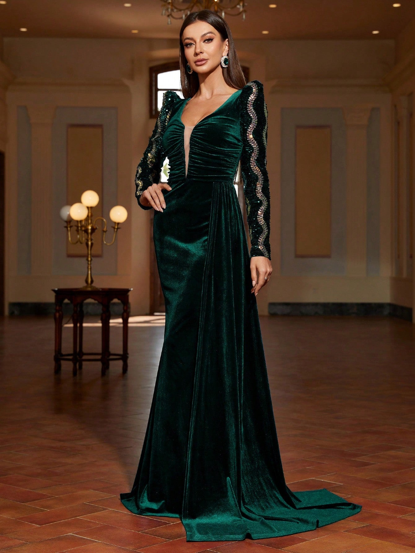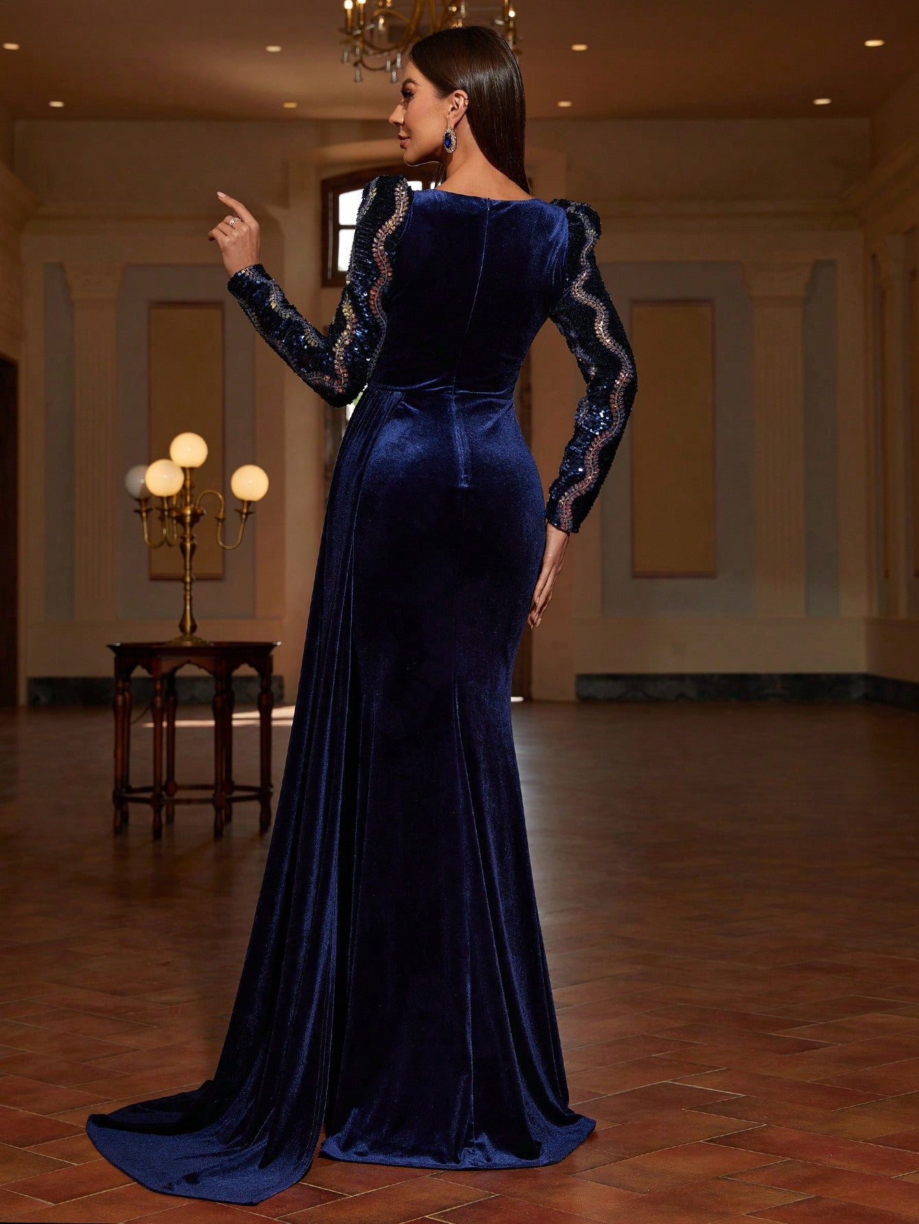 LLstyle Contrast Sequin Ruched Front Velvet Formal Dress