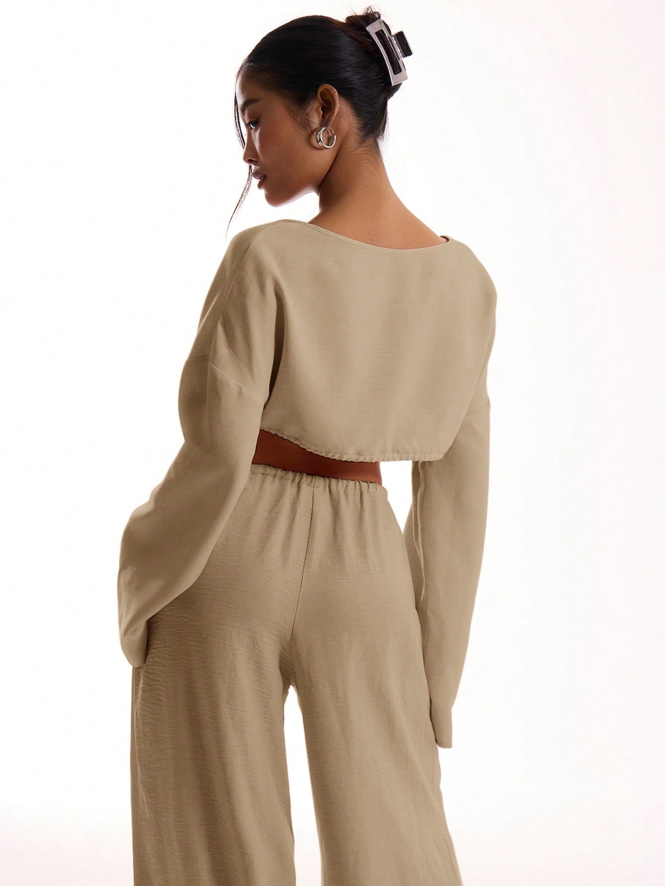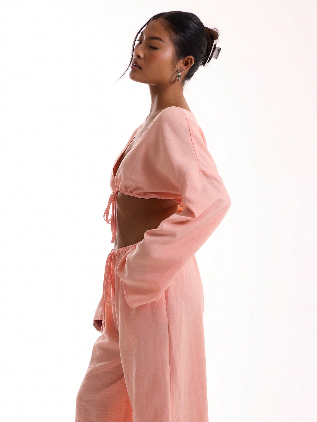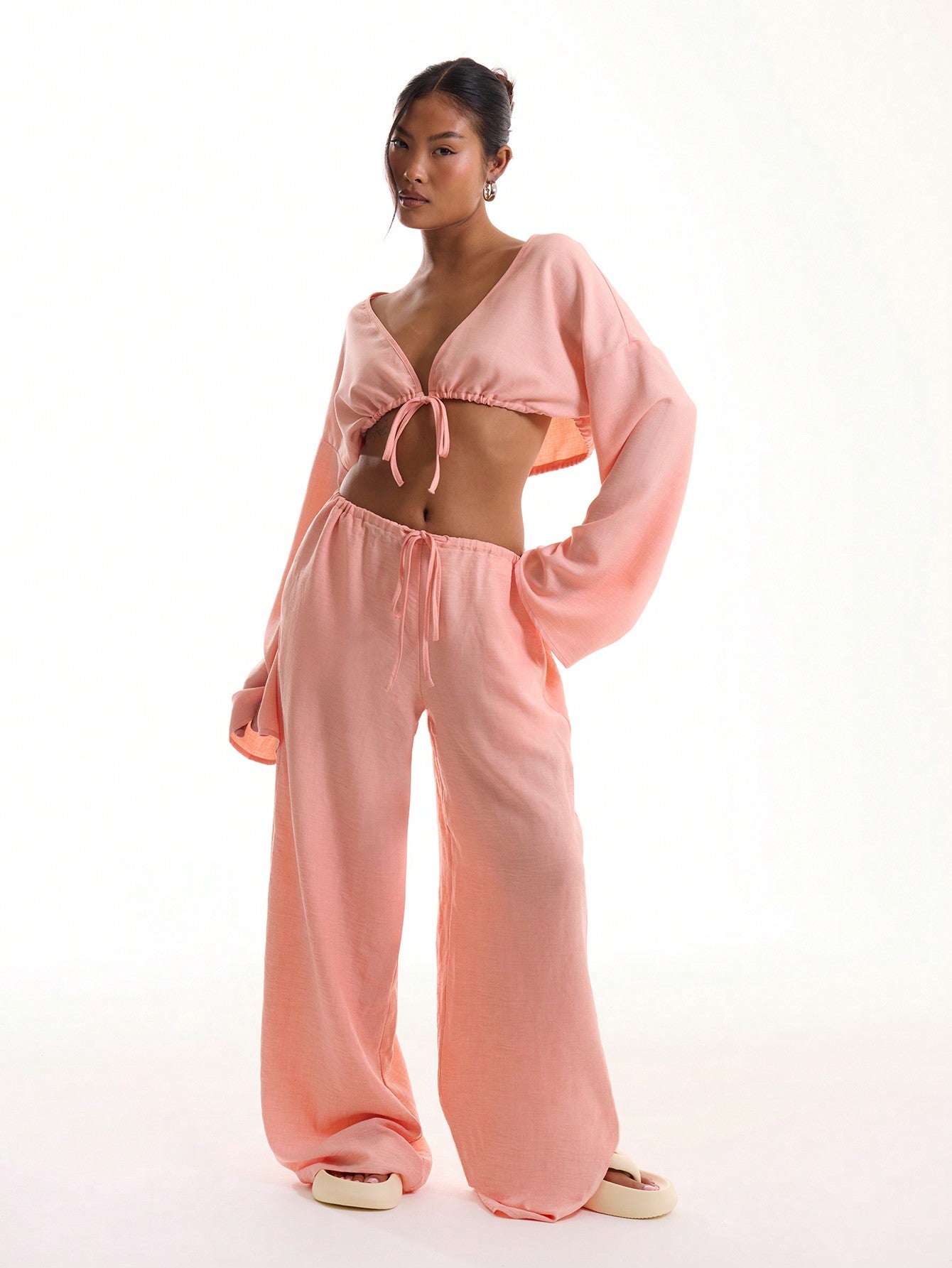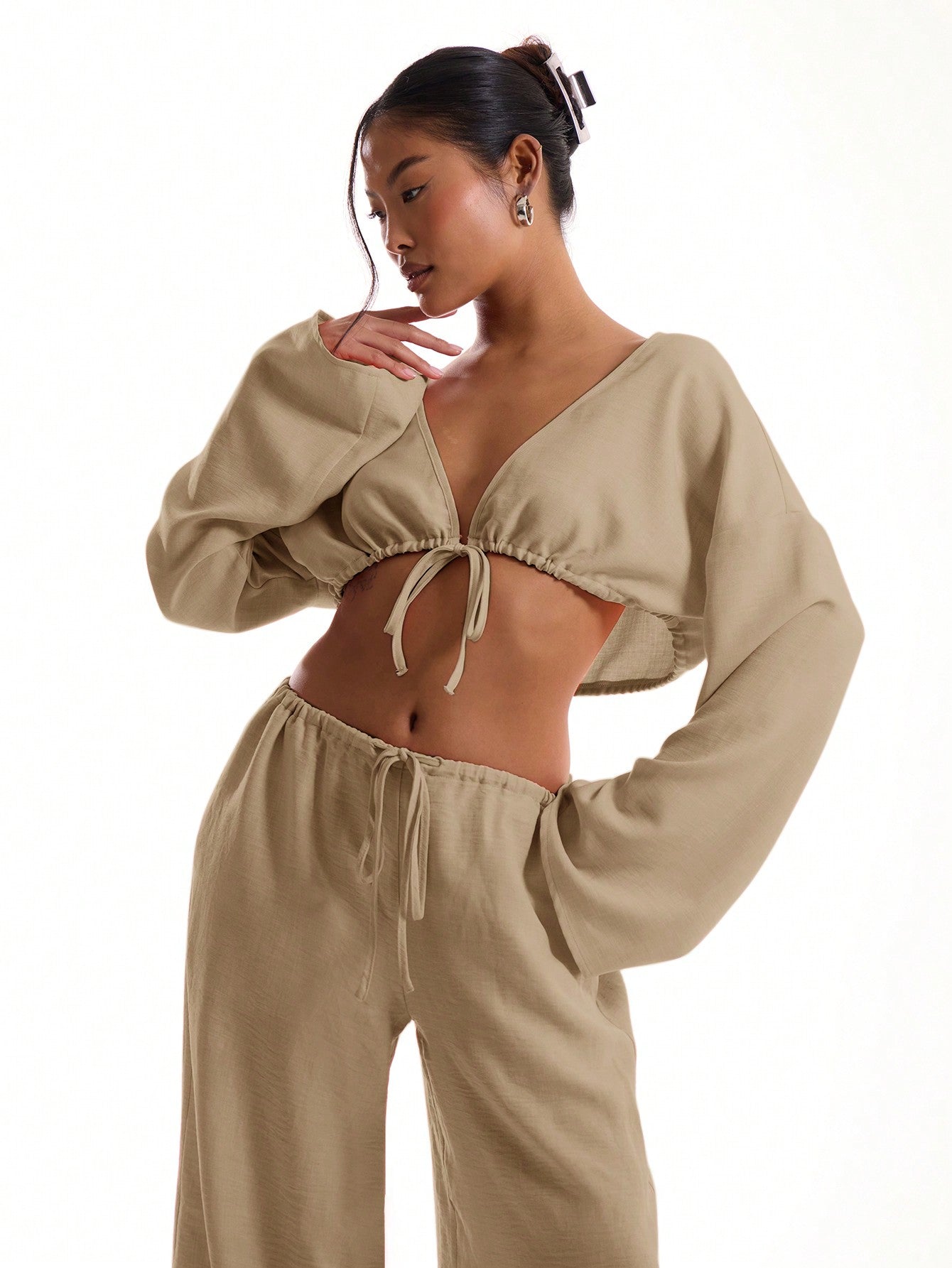 LLstyle Linen Feel Tie Front Wide Sleeve Beach Top