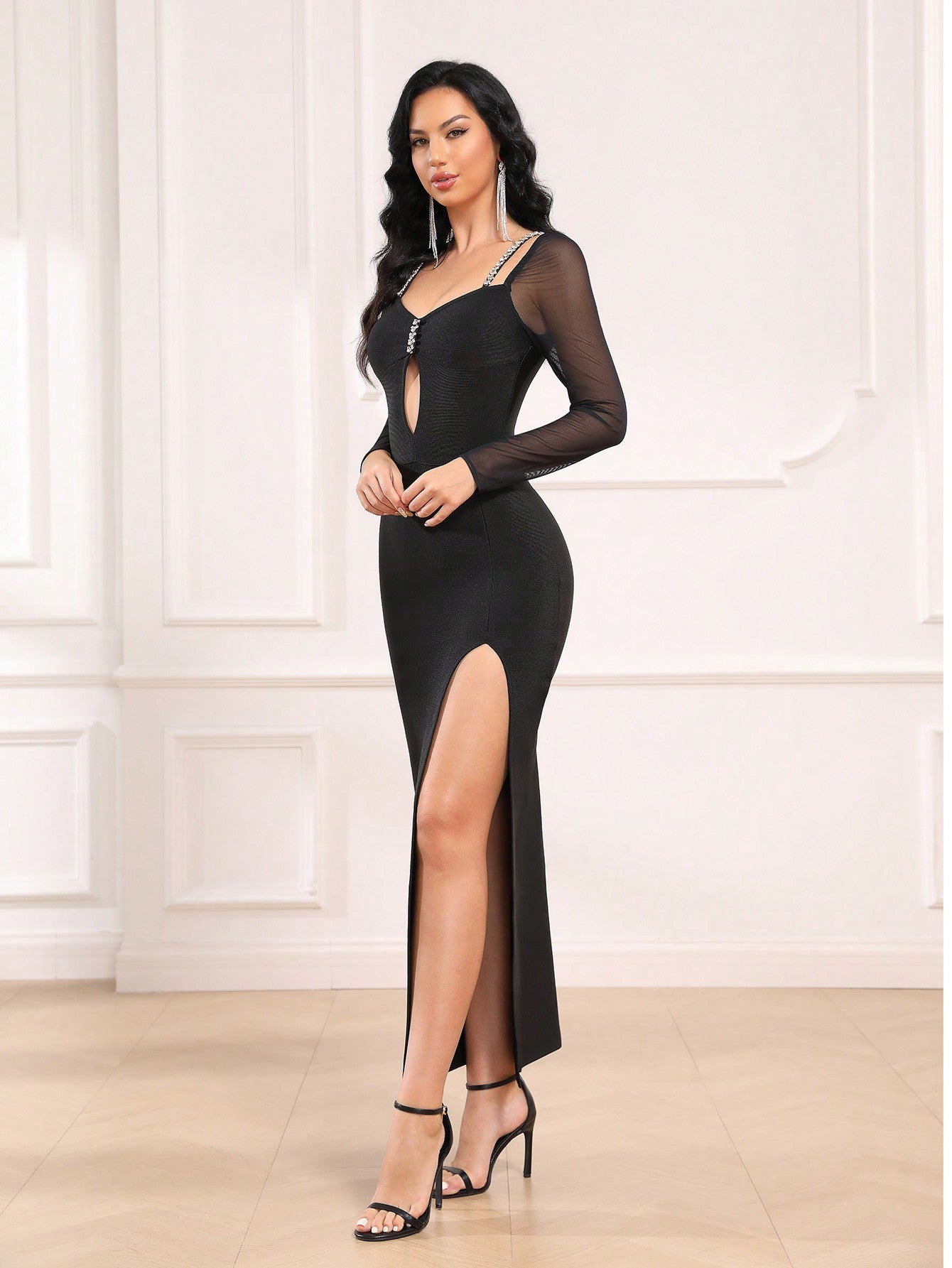 LLstyle Black 3D Floral Appliqué Slit Dress