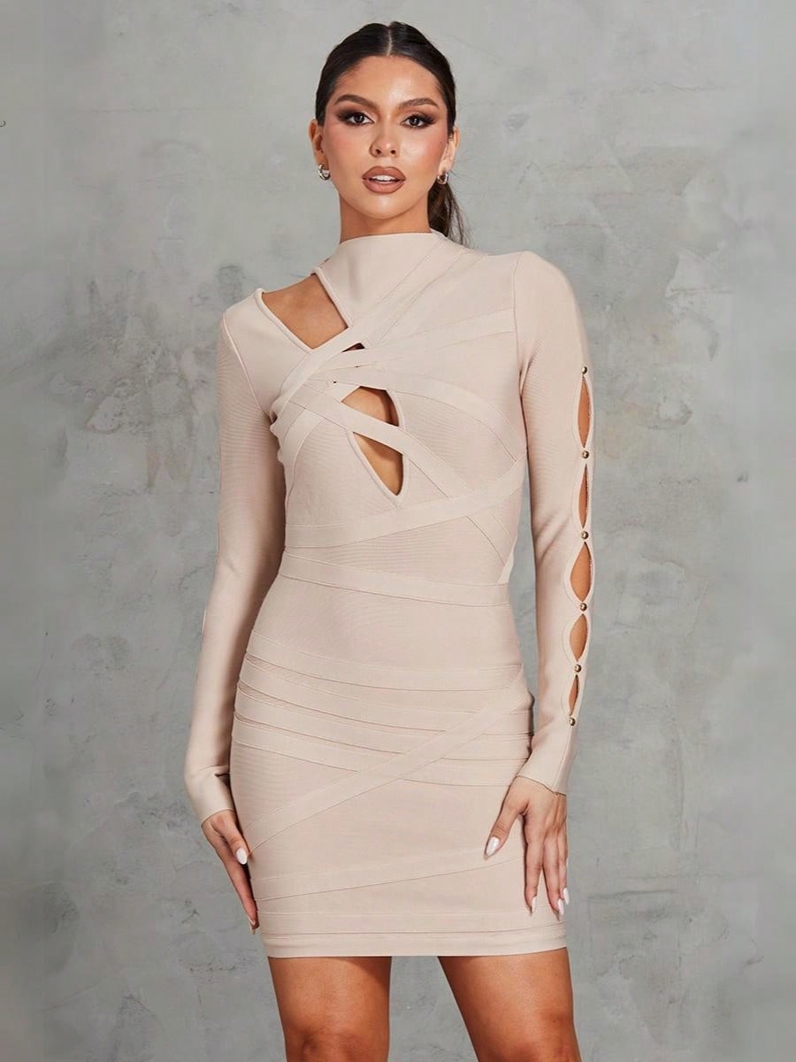 Step into sleek sophistication with this sexy nude dress, featuring a high neck and flattering slim fit that contours your silhouette. Designed with a high waist and pencil hem, it adds elegance while bold cut-out details and gold buttons bring a modern, edgy twist. The long sleeves balance the daring elements, making it perfect for nights out or upscale events. Made from slightly stretchy fabric with 95% polyester and 5% elastane, it’s best cared for with a gentle hand wash no dry cleaning needed.