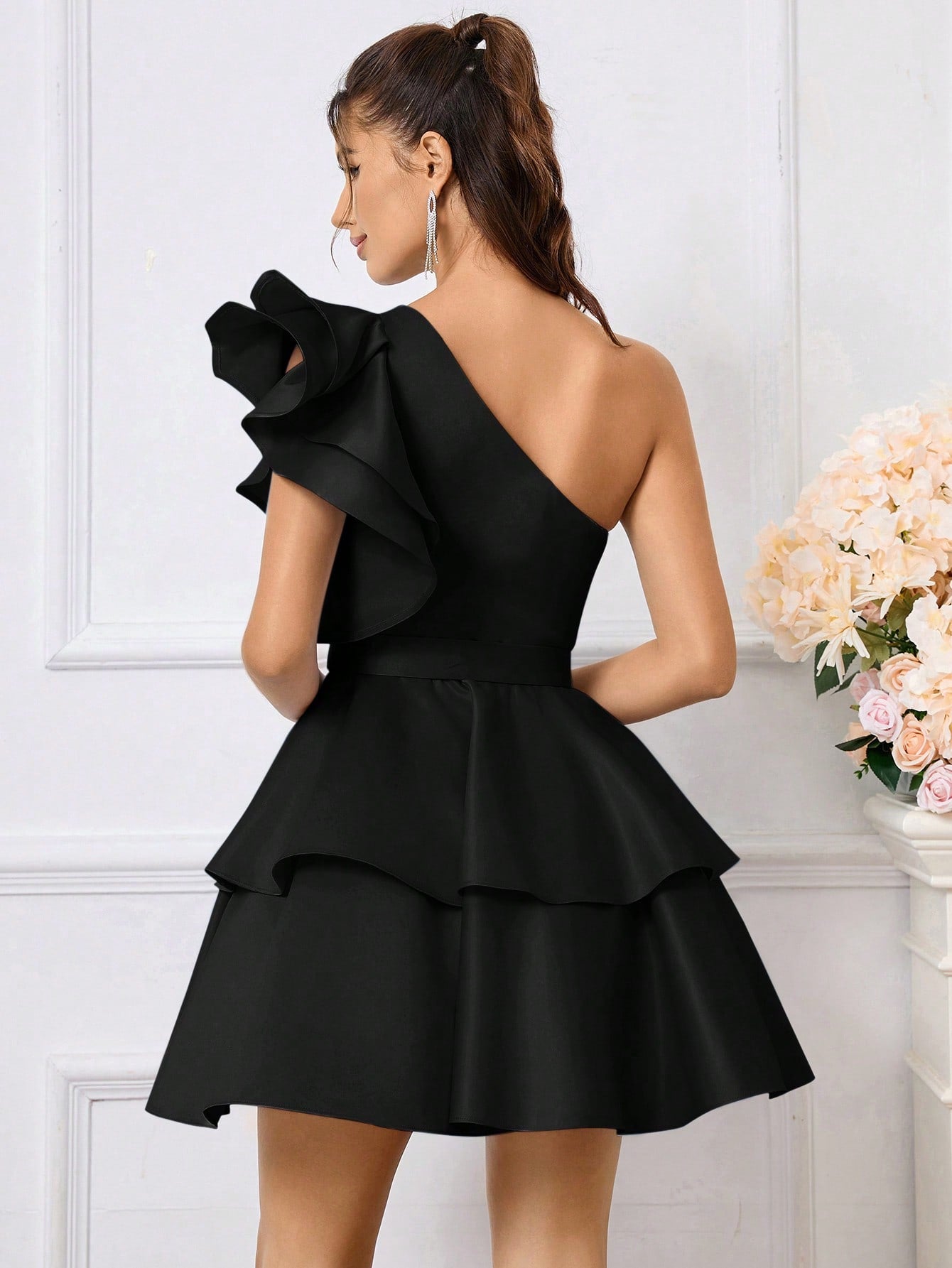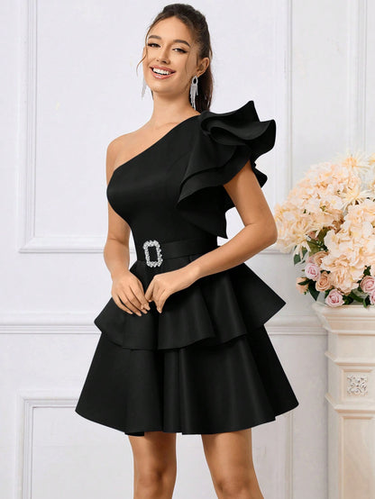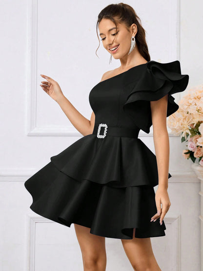 LLstyle One Shoulder Ruffle Waist Rhinestone Decor Dress