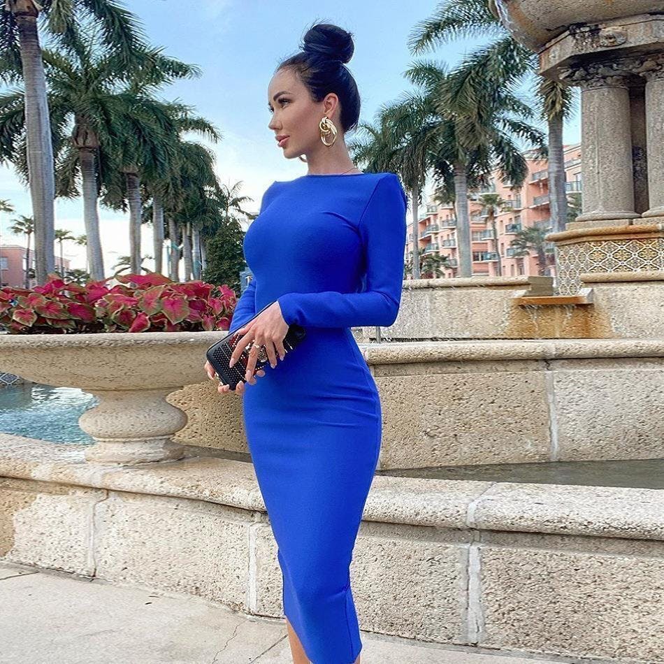 This striking cobalt blue midi dress features a sleek long-sleeve silhouette with a refined round neckline, designed to contour the body with precision. Crafted from smooth, high-stretch knitted fabric, it enhances the waist and elongates the figure for a clean, sculptural look. Minimalist yet powerful, this fitted design delivers effortless sophistication—perfect for cocktail events, evening outings, or elevated day-to-night styling.