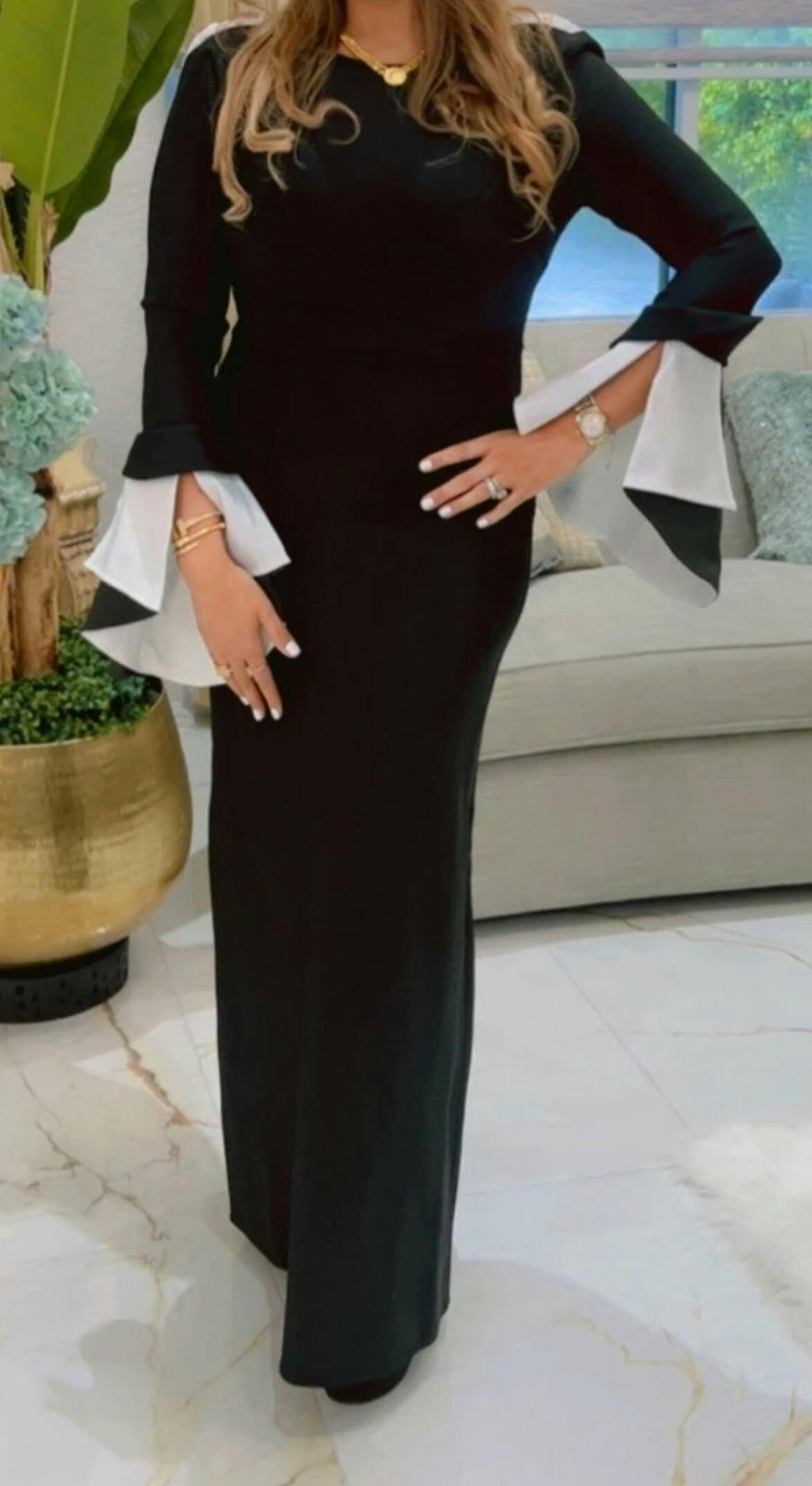 This black long pencil dress features a high waist and elegant flare sleeves, creating a refined and feminine silhouette. Designed with ruffle accents, a sleek split hem, and a discreet zipper, it blends sophistication with a touch of drama. Crafted from medium-stretch knitted fabric, it offers comfort and style perfect for formal events, dinners, or evening occasions.