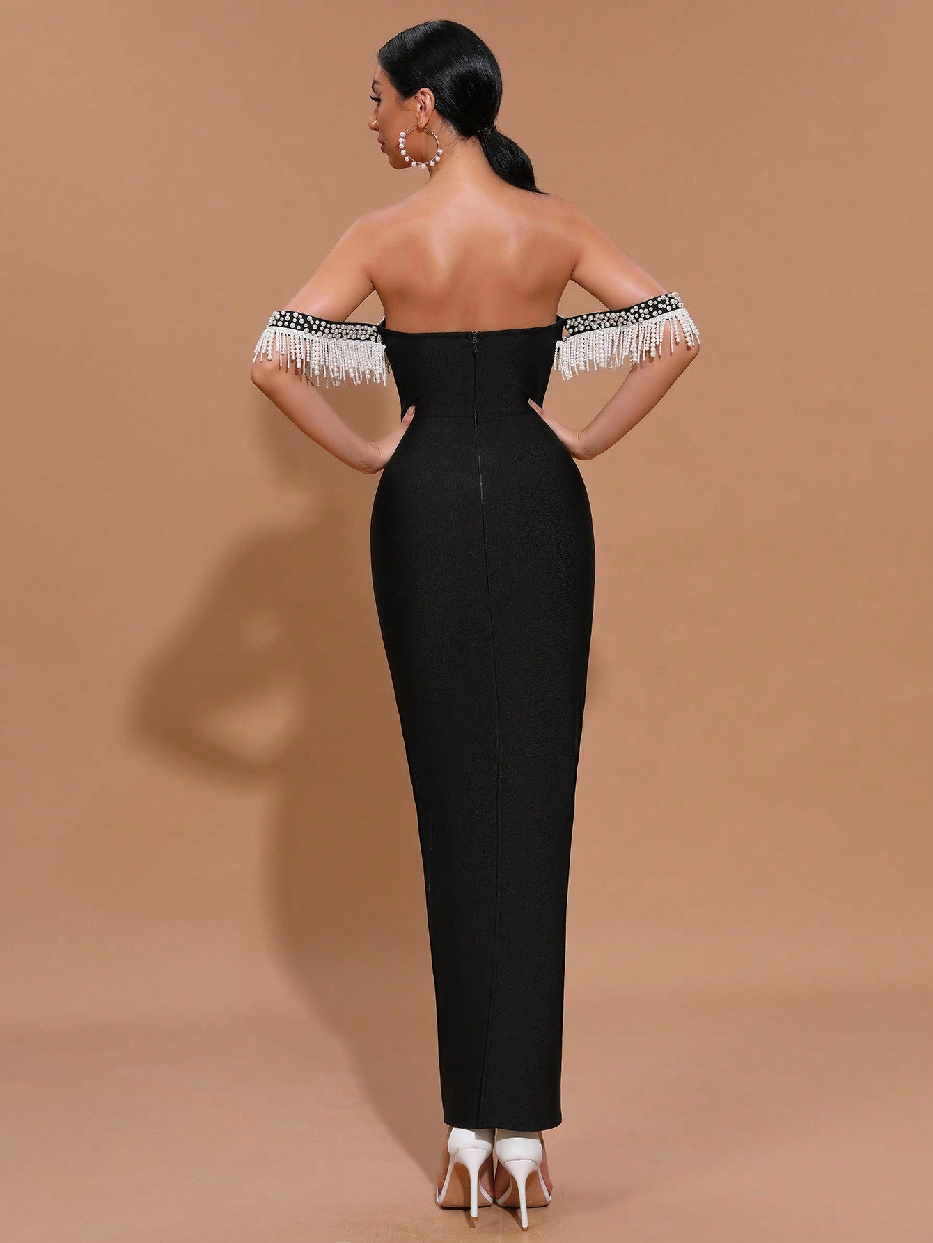 LLstyle Black 3D Floral Appliqué Slit Dress
