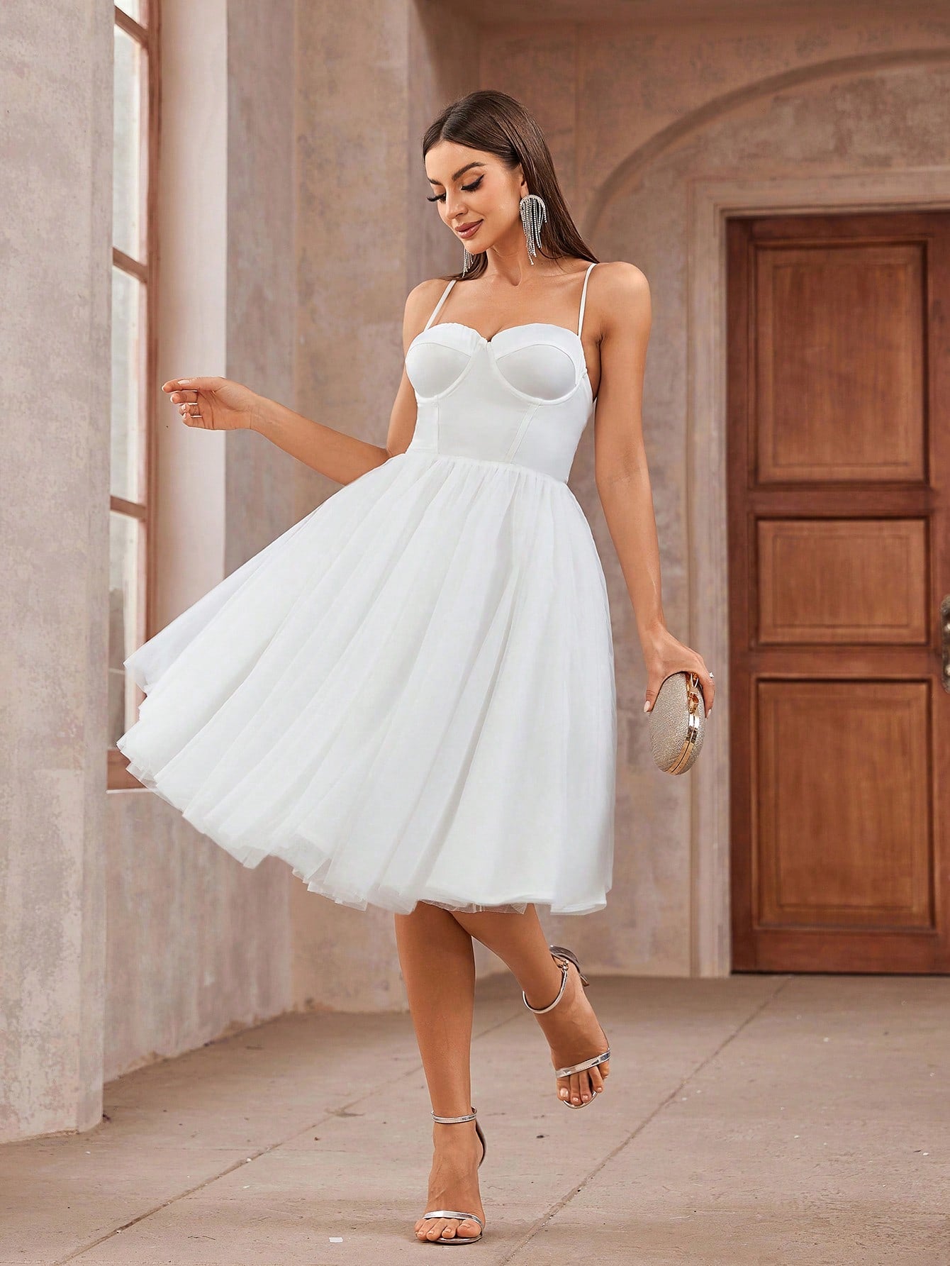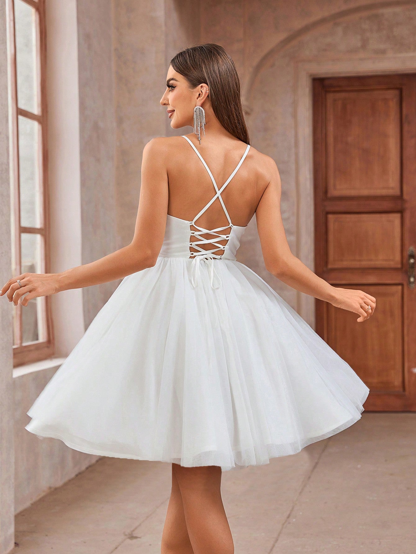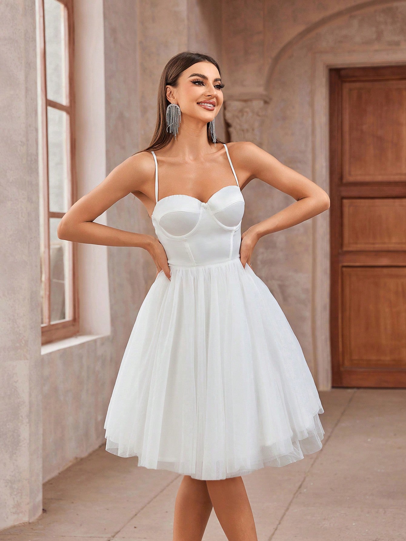 This white knee-length dress features a slim fit with spaghetti straps and a backless design. It includes contrast mesh detailing and a zipper closure for added style. Made from non-stretch polyamide, it is easy to maintain with machine wash or professional dry clean.