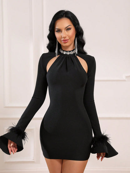 LLstyle Women Round Neck Feather Trumpet Sleeves Bodycon Dress